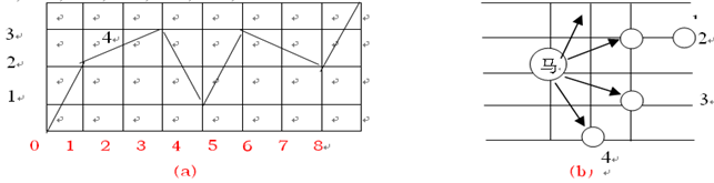 中国象棋半张棋盘如图(a)所示。马自左下角往右上角跳。今规定只许往右跳,不许往左跳,且要求马跳的方式按照(b)图顺时针深度优先递归。比如图(a)中所示为一种跳行路线。如果马要从0,0点,跳到4,8点,前6种跳法的打印格式如下,请参考前6种跳的方式,输出马从0,0点到4,8点所有可能的跳的路线。
