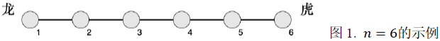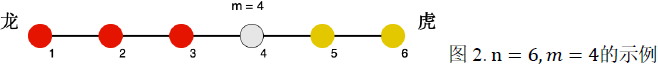 下面图 2 为 n = 6,m= 4 的示例,其中红色为龙方,黄色为虎方: