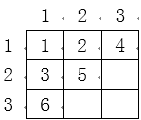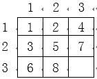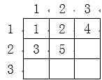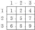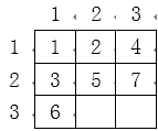 马里奥是一个快乐的油漆工人,这天他接到了一个油漆任务,要求马里奥把一个 n 行 m 列的矩阵每一格都用油漆标记一个数字,标记的顺序按照广度优先搜索的方式进行,也就是他会按照如下方式标记: