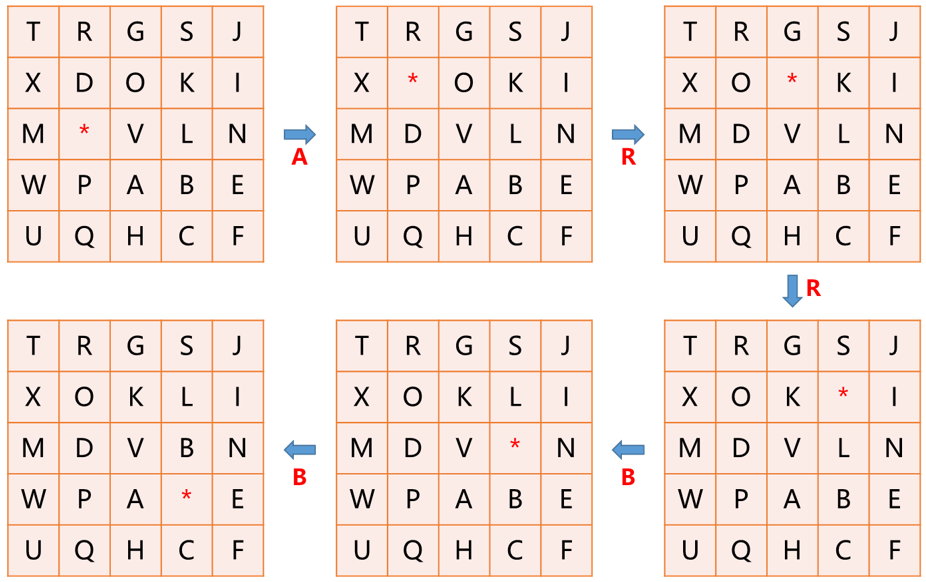 一共有 4 种指令:A、B、L、R,分别表示把空格上、下、左、右的相邻字母移到空格中。输入初始网格和长度为 5 的指令序列,输出指令执行完毕后的网格。保证所有指令都能正常执行。