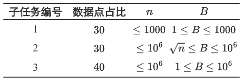 对全部的测试数据,保证 1 \leq n, B \leq 10^6。