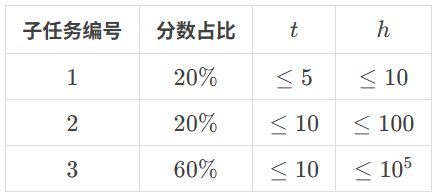 对于全部数据,保证有 1\le t \le 10, 1\le h \le 10^5。