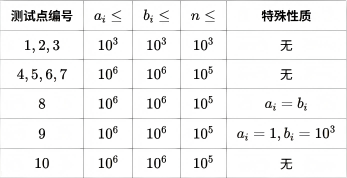对于所有的数据: n \le 10^5;0\le a_i\le b_i\le 10^6。